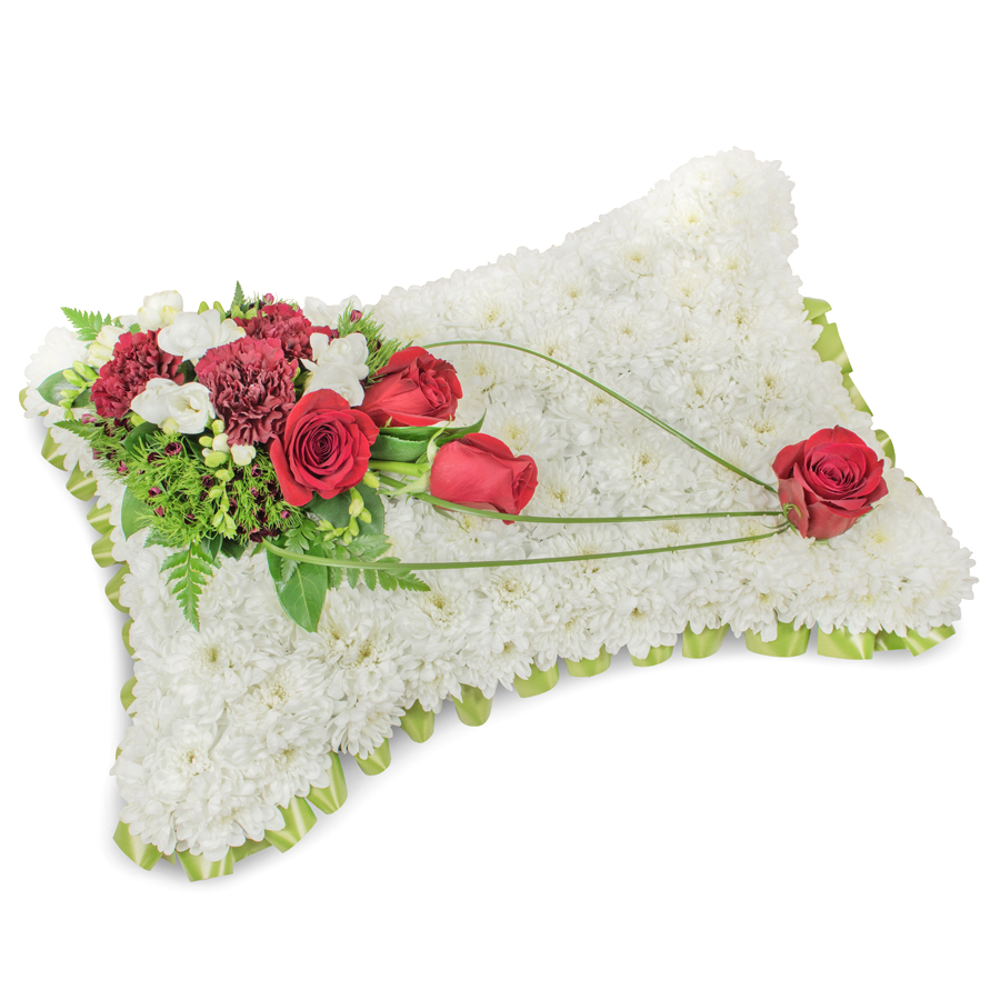 Share your deepest sympathies with our sophisticated flower bouquet, elegantly combining white chrysanthemums, red roses, and white freesias. Each flower is hand-selected for superior freshness and quality, crafting a heartfelt and graceful tribute.